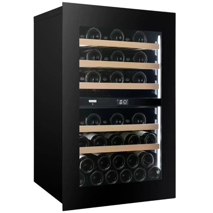 Внутреннее пространство рассчитано на 44 бутылки 0.75 л и общий объем 120 литров, что подходит для семейных коллекций и небольших ресторанных запасов. Пять деревянных полок берегут корки винных пробок и уменьшают вибрации, что важно для длительного хранения. Дверь с правым упором можно перенавесить, чтобы адаптировать расположение к планировке помещения. Встроенная подсветка аккуратно подсвечивает ряды бутылок, упрощая выбор напитка и подчеркивая оформление.
