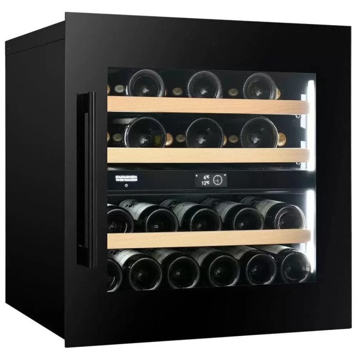 Винный шкаф Dunavox DVP-25-65DB представляет собой компактный встраиваемый прибор в строгом черном исполнении с элегантной стеклянной дверью. Корпус аккуратно вписывается в мебель высотой 59.6 см и шириной 59 см, а габариты ниши для встраивания 58.9×56×55.9 см облегчают монтаж при подготовке столешницы или отдельного шкафа. Стеклопакет защищает содержимое и одновременно позволяет демонстрировать коллекцию, а возможность перенавешивания двери дает свободу при планировании расположения. Трехполочная расстановка и деревянные направляющие создают аккуратную экспозицию бутылок и придают интерьеру теплоту натурального материала.