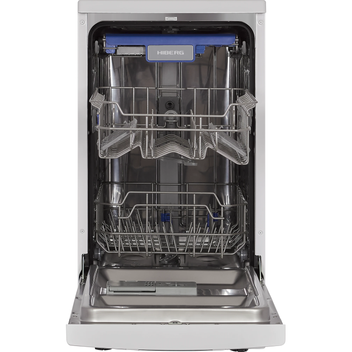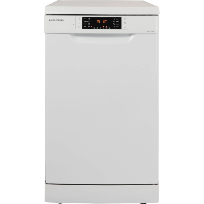 Узкая и отдельностоящая посудомоечная машина HIBERG F48 1030 W -оптимальный вариант для малогабаритных кухонь и ежедневного использования. Модель характеризуется высоким классом энергоэффективности А++, низким уровнем шума, вместительностью до 10 комплектов посуды и 8 автоматическими программами. Панель с дисплеем и электронным управление позволит легко выставить нужный режим. Световые индикаторы на информационной панели укажут на необходимость заполнения емкости ополаскивателя и контейнера с солью.