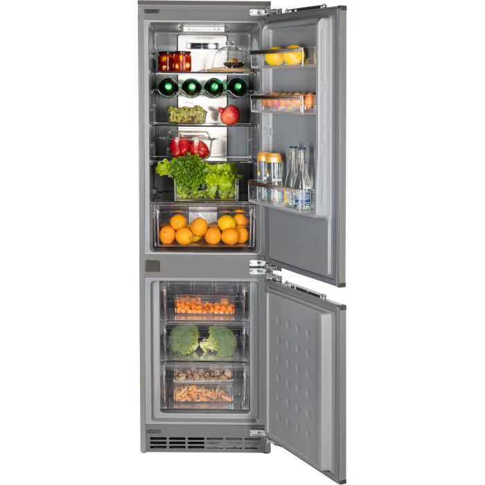 Встраиваемый холодильник HIBERG i-RFCB-400F NF с инверторным компрессором, автоматической системой охлаждения Total No Frost и электронным управлением — идеальный выбор для встраивания в кухонный гарнитур и создания комфортного пространства на кухне. Двери холодильника можно повесить на правую или левую сторону. Это позволяет открывать их в удобном направлении и устанавливать технику в любом месте. Корпус, как и внутренняя часть модели стильного серого цвета.