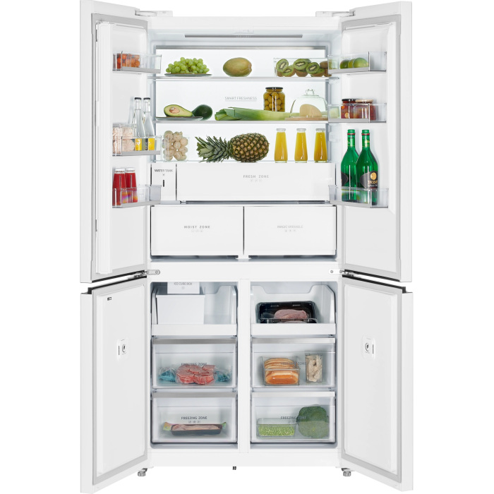 HIBERG i-RFQ 705G W — это уникальный четырехдверный холодильник с элегантным фасадом из белого стекла, рассчитанный на тех, кто ценит высокую вместимость, современный дизайн и функциональные решения. Высота модели составляет 191 см, а глубина — всего 60 см, что делает её идеальной для встраивания в кухонный гарнитур без зазоров и потери пространства. Такая компоновка особенно актуальна для современных интерьеров и не имеет прямых аналогов на российском рынке с точки зрения сочетания габаритов и функционала.