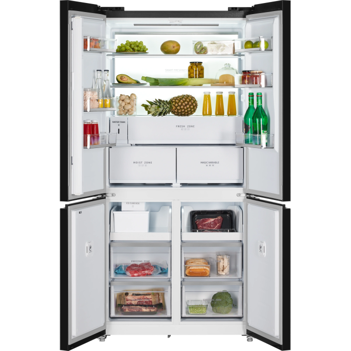 Впечатляющий общий объем 600 литров и продуманная организация внутреннего пространства позволяют легко распределять продукты, а двери с открытием на 90° обеспечивают полный доступ даже при установке рядом с мебелью. Фантомный сенсорный дисплей, встроенный в стеклянный фасад, сохраняет минимализм внешнего вида и интуитивность управления.