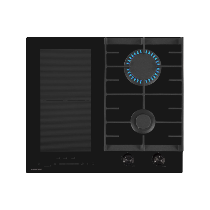 Комбинированная варочная поверхность HIBERG i-VM 6021 B выполнена из стеклокерамики черного цвета и оснащена 2 газовыми конфорками и 2 индукционными с возможностью объединения зон.