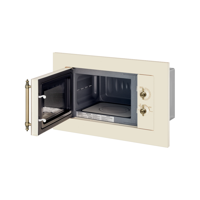 Благодаря компактным размерам СВЧ легко встраивается в шкаф шириной 60 см, что позволяет выдержать единую линию кухонного гарнитура. Эксклюзивный дизайн, корпус бежевого цвета и стеклянный фасад делают эту модель идеальным выбором для кухни в классическом стиле, стиле кантри или прованс. Металлические поворотные регуляторы времени и мощности обеспечивают удобное управление печью, позволяют легко настроить нужные параметры.