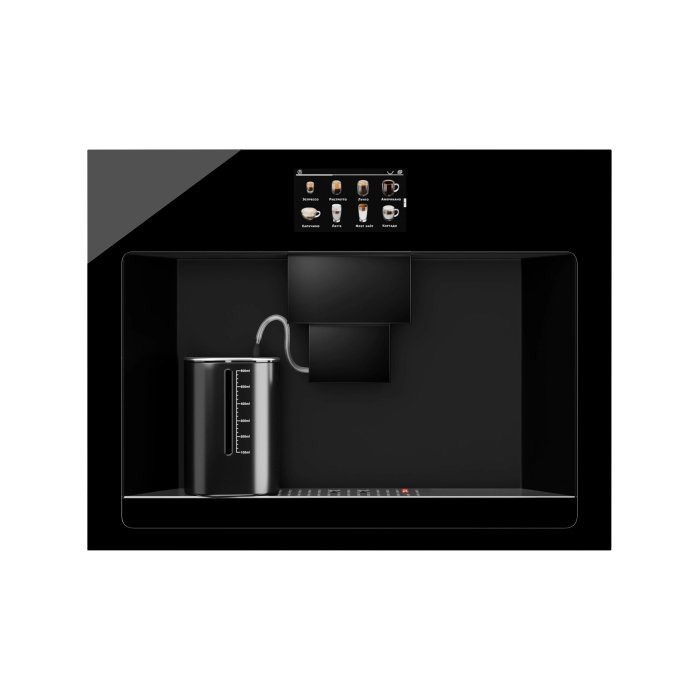Кофемашина со встроенным капучинатором гармонично вписывается в изысканные современные интерьеры благодаря фасаду из закаленного черного стекла и лаконичным металлическим элементам.