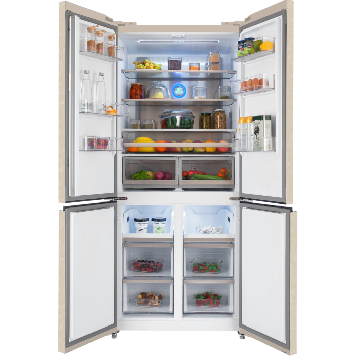 Четырехдверный холодильник HIBERG RFQ-600DX NFYm в эффектном цвете «бежевый мрамор» с возможностью встраивания идеально впишется в кухонный гарнитур, создаст стильную и уютную атмосферу. Модель общим объемом 526 литров предназначена для хранения большого количества продуктов и напитков в частных и загородных домах, просторных квартирах и современных крупных офисах.
