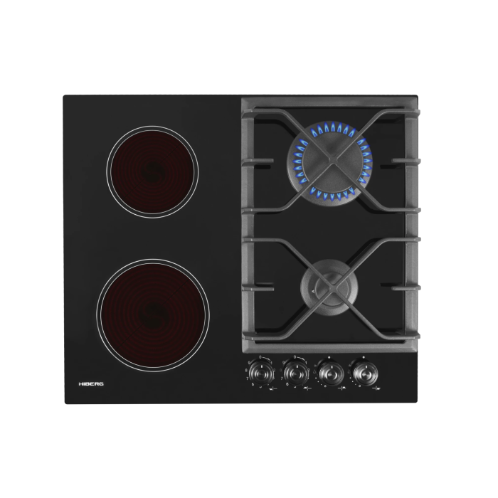 Комбинированная варочная поверхность HIBERG VM 6020 B выполнена из стеклокерамики черного цвета и оснащена 4 конфорками.
