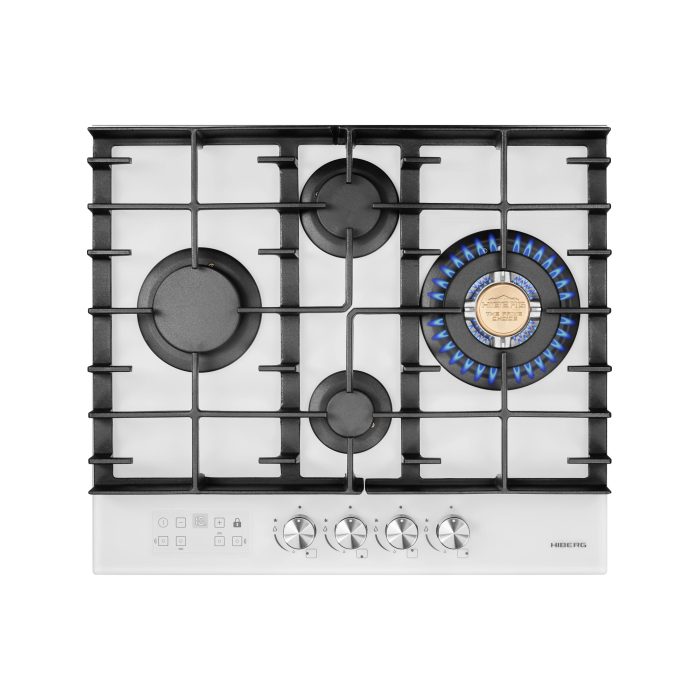 Газовая варочная поверхность HIBERG VM 6245 W оснащена четырьмя газовыми конфорками с функциями автоматического электророзжига и газ-контроля.