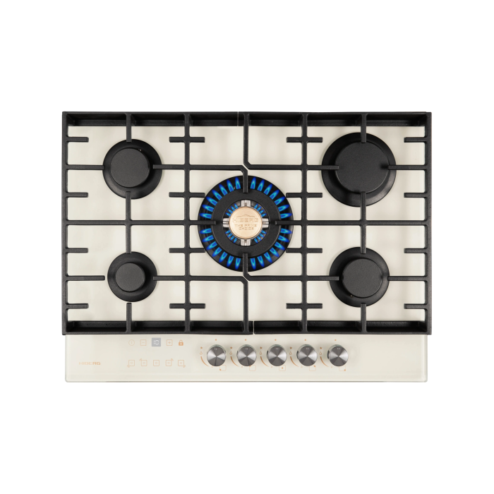 Встраиваемая газовая варочная поверхность HIBERG VM 7155 Y из закаленного стекла в бежевом цвете и ретро-стиле, оснащена 5 конфорками и функциями: автоматический «электророзжиг», «газ-контроль» и сенсорный таймер отключения газа.