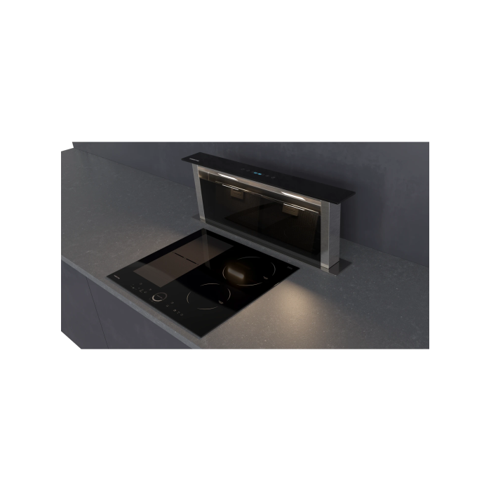 Встраиваемая в столешницу вытяжка HIBERG VTMF 90100 B – это современное инновационное решение для создания комфортных условий на вашей кухне. Вытяжка имеет 9 уровней мощности и работает только в выдвинутом положении, при выключении обратно убирается в стол. В закрытом виде – это элегантная черная стеклянная панель на поверхности стола, которая подходит для больших современных кухонь с островом или кухонного гарнитура без верхних шкафов.