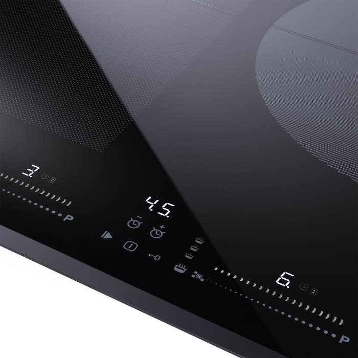 Индукционная варочная поверхность с технологией непрерывного нагрева и функцией Flex Zone. Итальянская стеклокерамика ILVA Glass с белой индикацией управления.