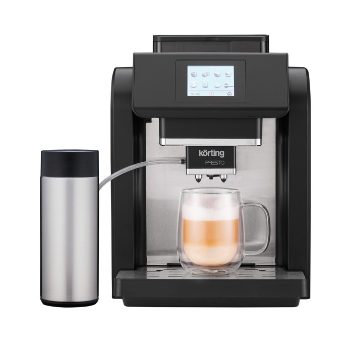 Кофемашина Korting KACM 2009 Presto открывает мир высококачественного кофе. Сдержанный дизайн в черном цвете с элементами из нержавеющей стали станет стильным дополнением любой кухни. Модель оснащена итальянской помпой с давлением 19 бар, что гарантирует насыщенный вкус и аромат любимого напитка. Korting KACM 2009 Presto позволяет настроить и сохранить собственный рецепт кофе. Доступны 5 степеней помола, возможность настройки крепости и температуры напитка, а также 7 автоматических программ. Сенсорный экран обеспечивает простое и понятное управление, а подогрев чашек помогает сохранять правильную температуру и способствует большему раскрытию вкуса и аромата кофе. Стойкая молочная пенка легко взбивается с помощью встроенного капучинатора, который легко поддерживать в идеальном состоянии благодаря автоматической очистке. Резервуар для молока, входящий в комплект этой кофемашины от Korting, можно убирать на хранение в холодильник.