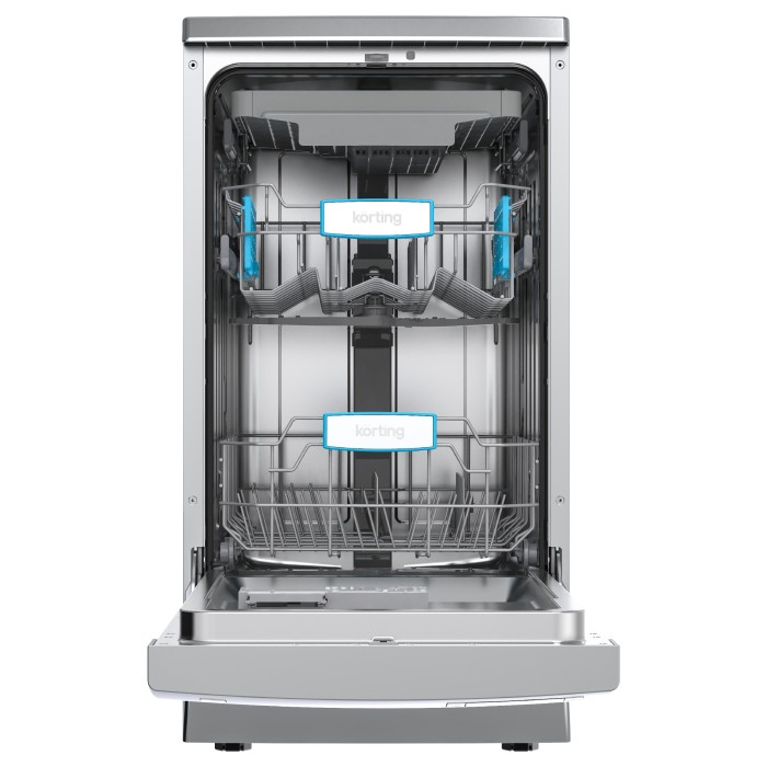 Эта модель оснащена восьмью различными программами мойки, включая стандартную, интенсивную, экономную, быструю мойку и даже специальную программу для стекла. Такое разнообразие позволяет выбрать наиболее подходящий режим в зависимости от типа и количества посуды. Кроме того, машина оснащена функцией половинной загрузки, что позволяет экономить воду и электроэнергию при мойке небольшого количества посуды. Посудомоечная машина Korting KDF 45678 S может вместить до 10 комплектов посуды, что делает ее идеальным выбором для средних и больших семей. Внутри машины находятся три корзины, включая сдвижную мини-корзину для столовых приборов. Высоту верхней корзины можно регулировать с помощью системы Easy Lift для удобства загрузки посуды различных размеров.