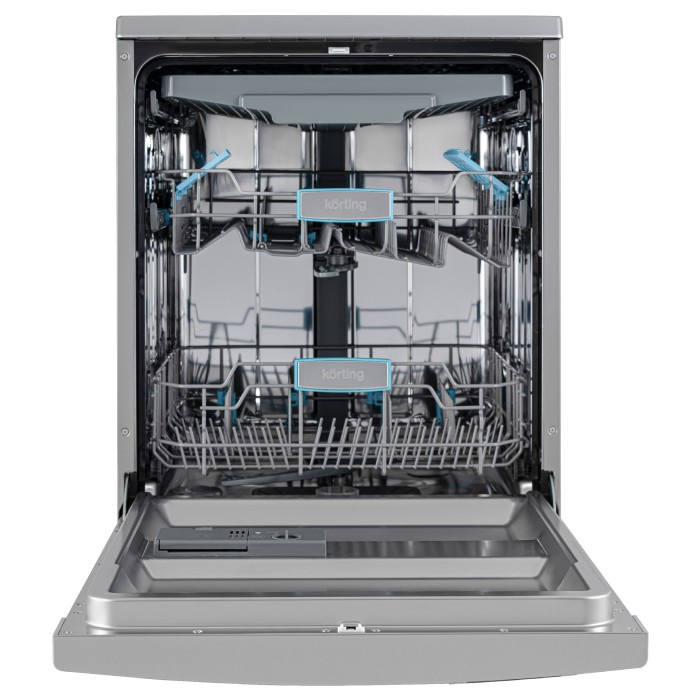 Внутреннее пространство продумано до мелочей: камера из нержавеющей стали устойчива к коррозии и легко очищается. Три уровня загрузки включают верхнюю корзину с системой Easy Lift (её можно поднять, освободив место для высоких бокалов), средний отсек для хрупкой посуды и нижнюю корзину под кастрюли и сковороды. Отдельная C-Shelf для столовых приборов предотвращает их перемешивание и ускоряет расстановку. Проточный ТЭН обеспечивает быстрый и равномерный нагрев, а два S-образных разбрызгивателя охватывают всю посуду мощными, но экономичными струями. Встроенная система фильтрации, тестер жёсткости воды и слайдерный диспенсер для моющих средств упрощают подготовку. Благодаря активной сушке и качественной мойке прибор получил класс A по обоим параметрам — посуда выходит чистой и без разводов.