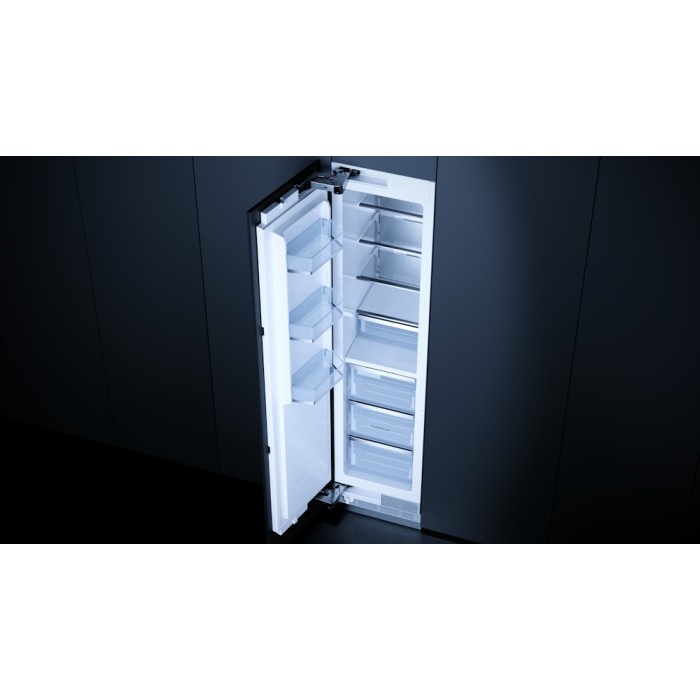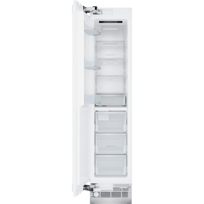 Встраиваемый морозильник Kuppersbusch FGX 9800 0i сочетает минималистичный облик K-series.8 и возможность скрытой установки под фасад. Устройство предлагается «под навес вашего фасада», что обеспечивает единую линию кухонного интерьера без выступающих ручек. Конструкция с жестким креплением door on door гарантирует плотную стыковку панели и ровный фронт при монтаже в нишу 213,4×45,7×63,5 см. Габариты самого агрегата 212,3×45,1×59,2 см позволяют разместить его даже в узкой зоне кухни.