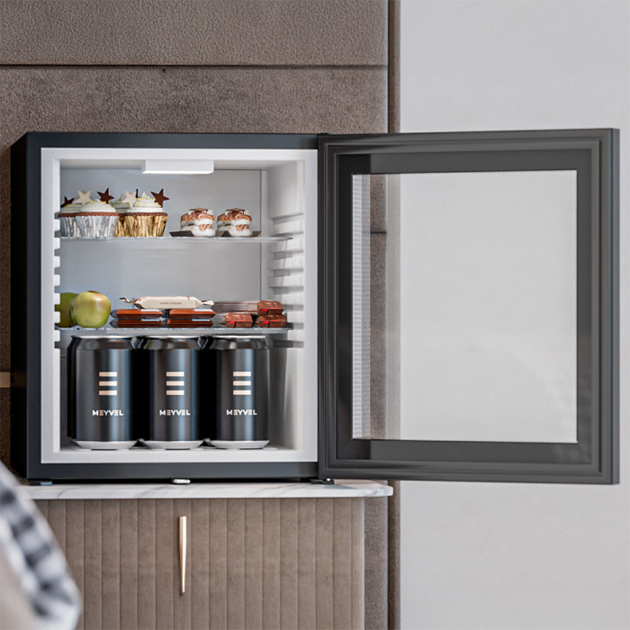 Серия MMT итальянского бренда MEYVEL представлена 5 моделями мини-баров с внутренним объемом от 30 до 60 литров. Каждая модель сочетает в себе эргономичную конструкцию, высокий класс энергопотребления, стильный дизайн. Благодаря гибридной системе охлаждения мини-бары работают бесшумно, так что устанавливать их можно даже в спальнях.