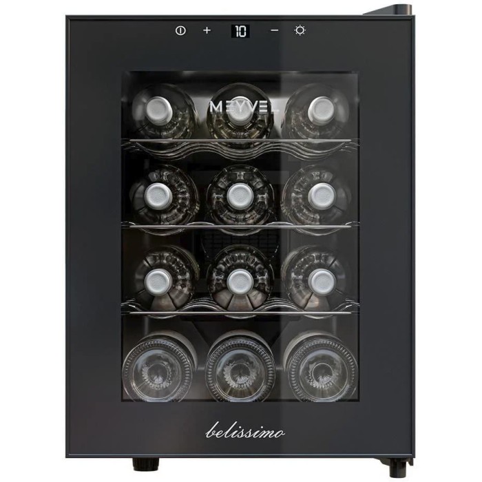 Внутреннее пространство продумано для комфортного хранения до 12 бутылок по 0.75 л при общем объеме 33 литра. Три хромированные металлические полки выдвигаются, что облегчает загрузку и доступ к коллекции. Встроенное мягкое освещение дает прекрасный обзор содержимого, не повышая температуры внутри. Диапазон влажности 60-80% и монотемпературный режим 10-18 °C создают стабильные условия для выдержки и краткосрочного хранения вин одного типа.
