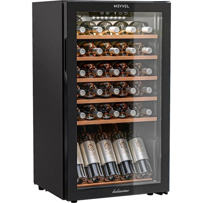 Винный холодильник Meyvel MV33-KBF1 имеет одну температурную зону, в которой можно разместить бутылки и единовременно выставить только одну комбинацию настроек. Он устанавливается отдельно, что удобно, если у вас есть специальное помещение — кладовая, погреб и т.д. Благодаря компактным размерам данная модель — отличный выбор для офиса, гостиничного номера. Количество бутылок, которое можно разместить с учетом полной комплектации и из расчета объема бутылки 0,75 л, — 30 шт.