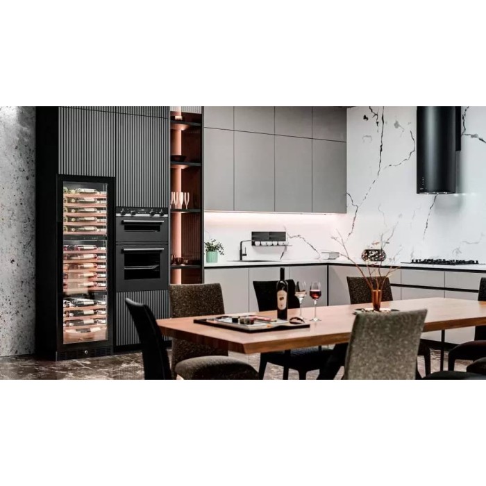 Стеклянная дверь — дополнительный изящный штрих к общему дизайну модели. Специальное покрытие защищает вино от влияния ультрафиолетовых лучей, которые проникают, если шкаф находится в солнечной комнате. Цвет корпуса — черный. Дверь можно перевесить на другую сторону, поэтому вариантов размещения его в доме становится больше.