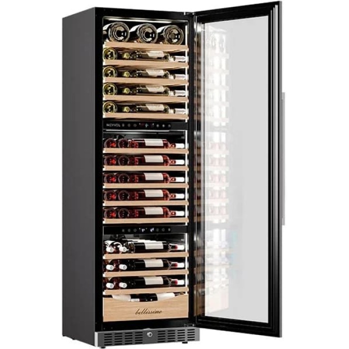 Винный шкаф Meyvel MV98-KST3 Slim — это современное решение для хранения винной коллекции, сочетающее в себе компактность, эстетичный внешний вид и высокоточную климатическую систему. Благодаря наличию трёх независимых температурных зон в одной камере устройство позволяет одновременно хранить различные категории напитков в оптимальных условиях: верхняя секция поддерживает температуру от 5 до 20 °C, что делает её универсальной для краткосрочного хранения или подачи; средняя зона настроена на прохладный режим 5–12 °C, который идеально подходит для белых, розовых и игристых вин; нижняя часть обеспечивает тёплый диапазон 12–20 °C, подходящий для выдержки красных сортов. Такая гибкость особенно ценна для гурманов и коллекционеров, стремящихся сохранить аромат, структуру и потенциал каждого напитка. Модель предназначена для встраивания: её габариты (179,2 × 59,5 × 55 см) идеально соответствуют стандартной нише (181 × 61 × 60 см), что позволяет гармонично вписать технику в кухонный гарнитур или барную зону без ущерба для дизайна интерьера. Охлаждение осуществляется с помощью надёжной компрессорной системы, обеспечивающей стабильность температуры и длительный срок службы. Влажность внутри поддерживается на уровне 60–80 %, что предотвращает пересыхание пробок и сохраняет герметичность бутылок. Упаковка (183 × 65 × 62 см) гарантирует безопасную транспортировку. Несмотря на небольшую глубину, шкаф отличается вместительностью и продуманной организацией внутреннего пространства. Бесшумная работа, энергоэффективность и точный контроль микроклимата делают его незаменимым для тех, кто относится к вину как к искусству.