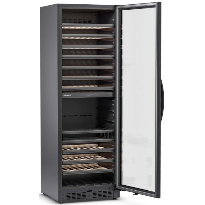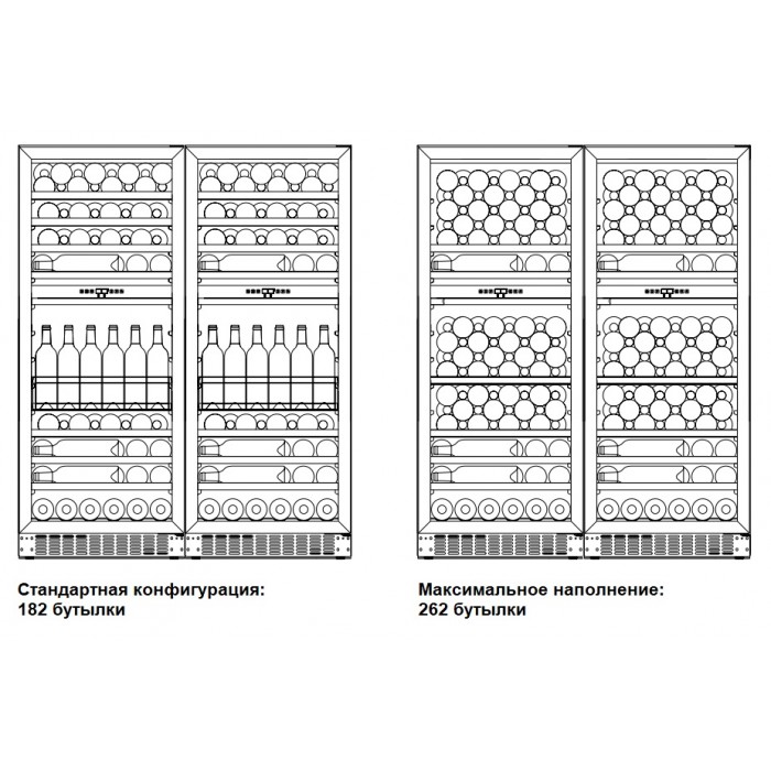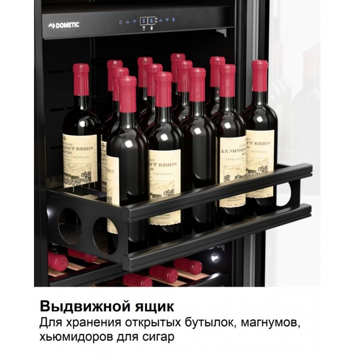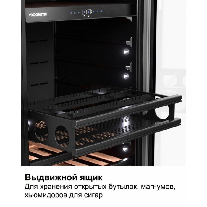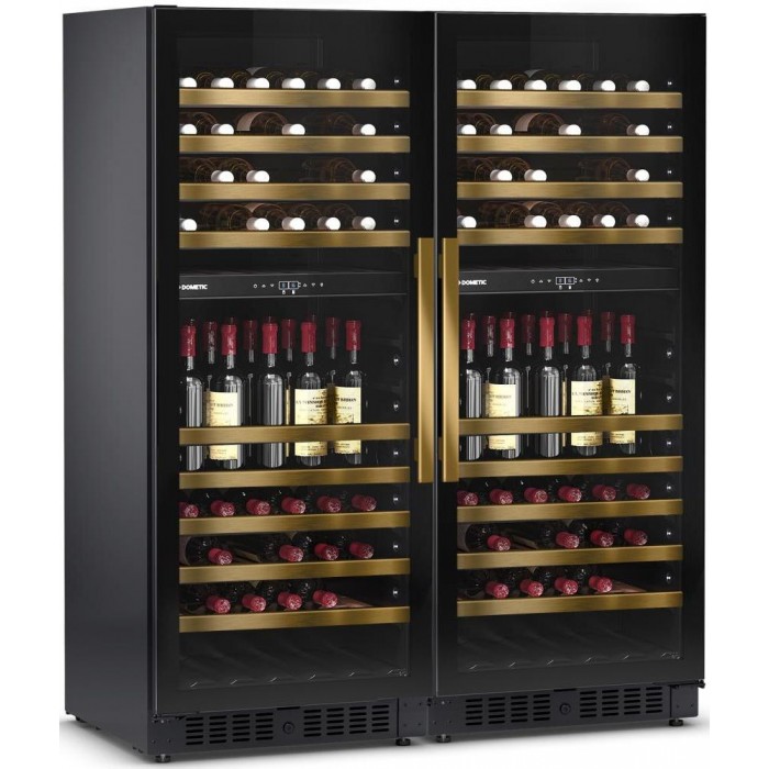 Винный холодильник Dometic E91FG Double Bronze имеет несколько температурных зон, в которых одновременно можно хранить разные сорта алкоголя и выставлять разные сочетания настроек. Он устанавливается отдельно, что удобно, если у вас есть специальное помещение — кладовая, погреб и т.д. Количество бутылок, которое можно разместить с учетом полной комплектации и из расчета объема бутылки 0,75 л, — 182 шт.