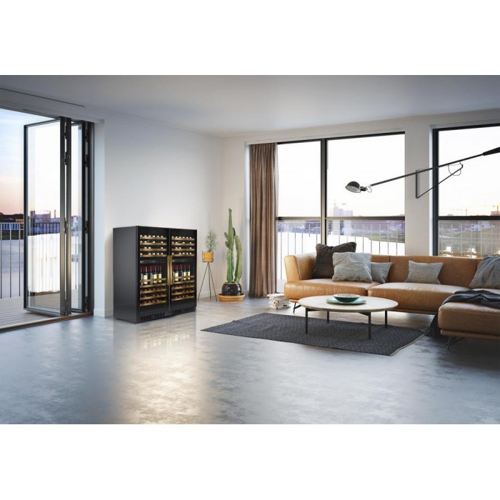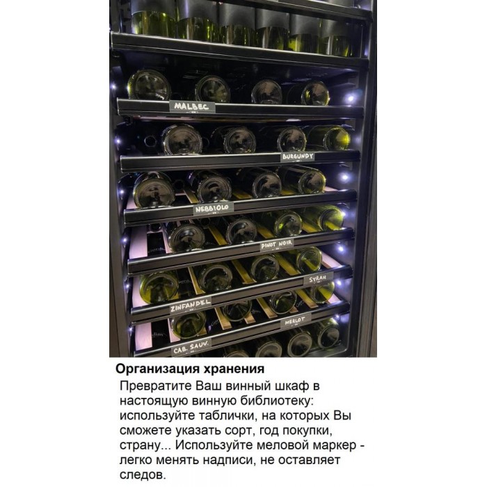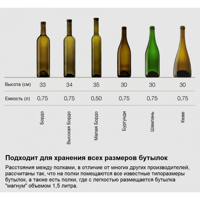Электронное управление помогает быстро разобраться в том, как функционирует эта модель, и легко настроить все необходимые параметры. На дисплее отображаются данные, которые собирают датчики в камере. Лампочки, расположенные внутри, хорошо подсвечивают бутылки. Всего полок, на которых можно разместить коллекцию, в шкафу 14 шт. Пространство тщательно вентилируется, чтобы воздух не застаивался, не попадали посторонние запахи.