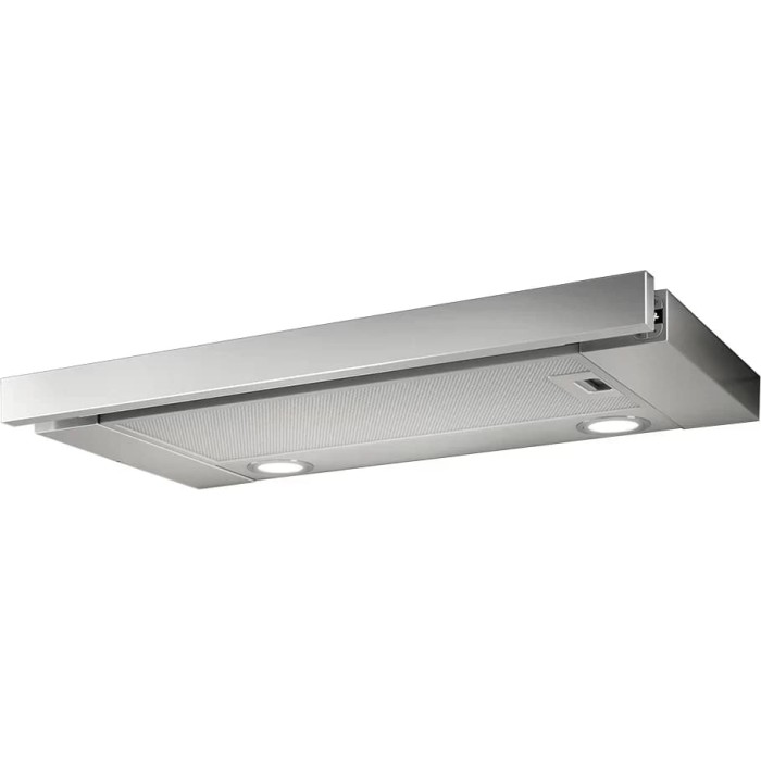 Вытяжка работает в режиме отвода: воздух проходит через многочисленные фильтры, а после вновь возвращается в помещение уже обезжиренным и чистым. Размер воздуховода составляет 120 мм, а уровень шума не превышает 61 Дб на максимальной скорости. Электронная панель оборудована сенсорными элементами управления, расположенными по бокам вытяжки. Также в эту модель встроены две галогенные лампы.